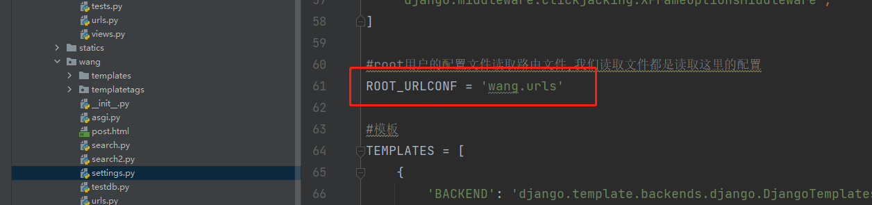 现在视图写好了,接下来是配置路由了,路由分为总路由和子路由,总路由默认是我们创建的项目里面的urls.py文件,我们也可以通过修改settings.py文件里面关于总路由的配置,去修改总路由