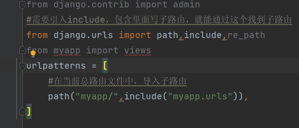 具体写法如下,当我们通过myapp/访问的时候,它会自动调用myapp.urls下面的路由地址