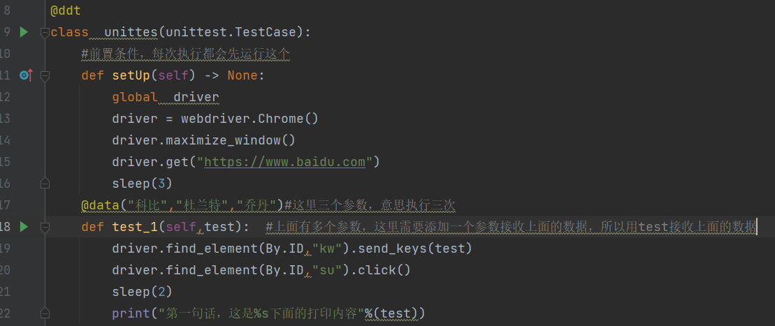 ddt:在类名上面加ddt的装饰器@ddt,表示要使用ddt,然后在用例上面加装饰器@data(),括号里面写需要的参数,写几个就循环几次