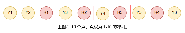 - 贪心地,将两种颜色的球分别排序:\(Y_1 \leq Y_2 \leq \cdots Y_{A-B}\),\(R_1 \leq R_2 \leq \cdots \leq R_{B}\)(限制一)。
