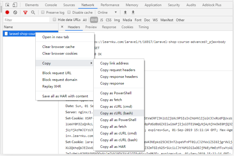 chrome 有个很好用的功能是,把请求复制为 curl 格式,如下: