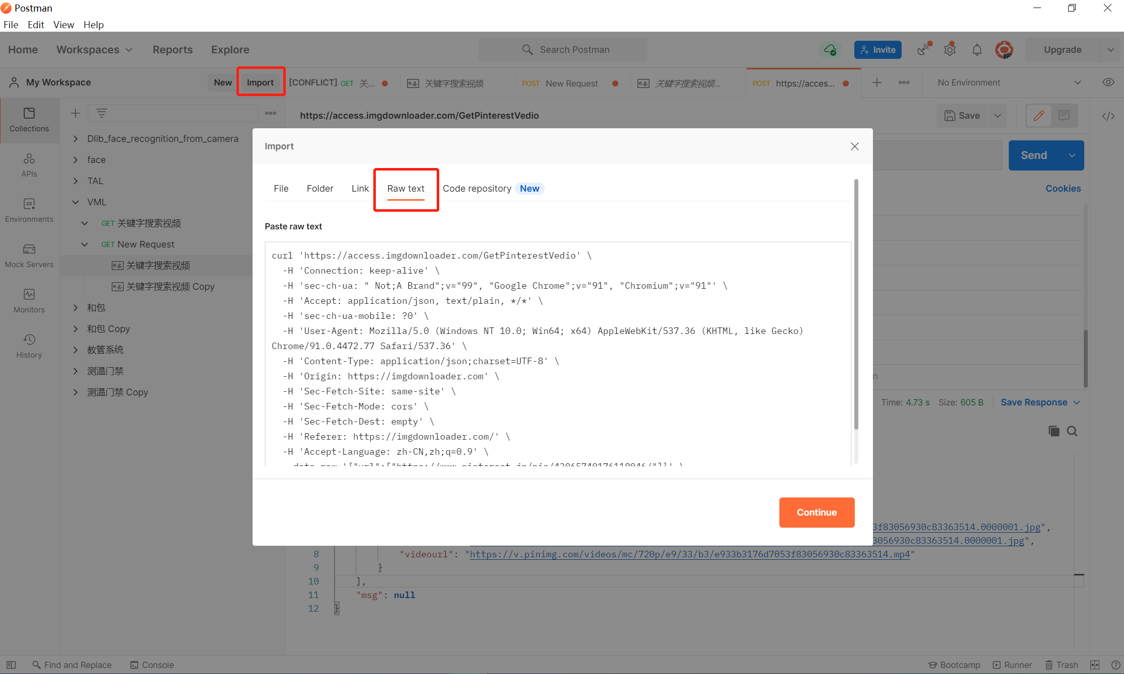 现在我们的粘贴板里面有个 curl 格式的请求,接下来我们打开 postman,点击左上角 Import,然后点 Paste Raw Text,然后点击 Import 完成导入。