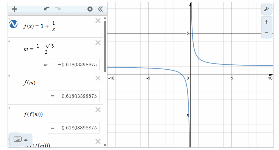 总的来说,函数的任何次迭代的图像都是关于直线\(y=-x+1\)对称;并且这些函数都经过公共点\((\cfrac{\sqrt{5}+1}{2},\cfrac{\sqrt{5}+1}{2})\)和\((\cfrac{1-\sqrt{5}}{2},\cfrac{1-\sqrt{5}}{2})\),