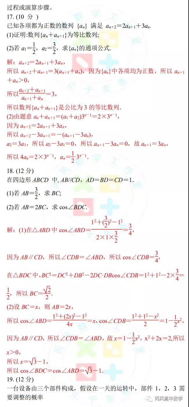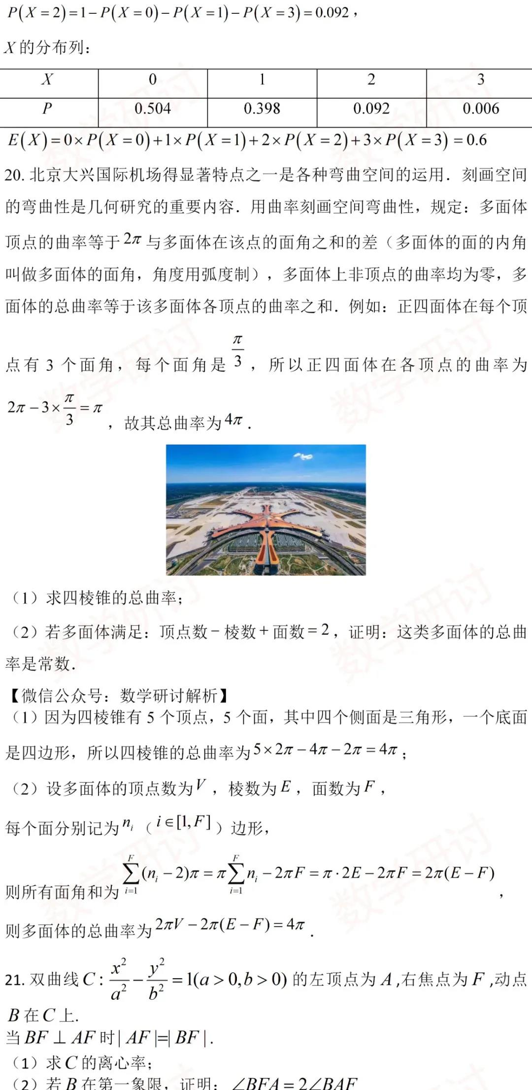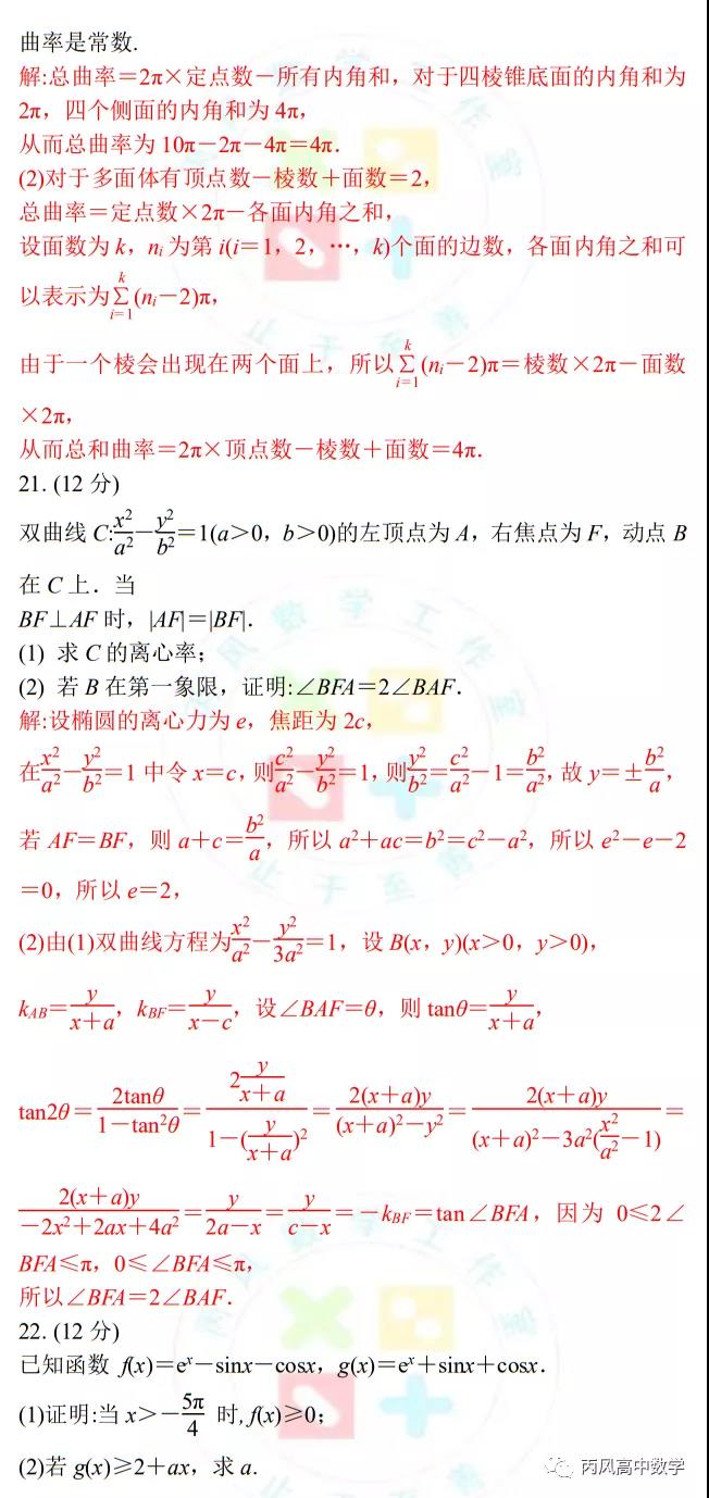 2、主干知识重点考察,数列、三角函数、概率统计、立体几何、解析几何、函数与导数依旧是支撑起试卷的主干,但立体几何与解析几何变化较大,尤其是前者。立体几何放在第4个解答题,中档偏上,但没有出现重点内容中的空间角和距离,而是以应用题的方式考查具有高等几何的背景——曲率,这是包括学生和老师都措手不及的。另外台体的体积公式是不要求记忆的,貌似试卷也没有给出计算公式,无怪乎很多人惊呼考试偏离了轨道。另外,解析几何的大题考查双曲线也是出乎意料的,高考已经将近十年没有出现了,老师们往往都振振有词地强调双曲线不考大题,教辅资料也成功回避了双曲线的大题,这次没想到杀了个回马枪,令人黯然神伤。