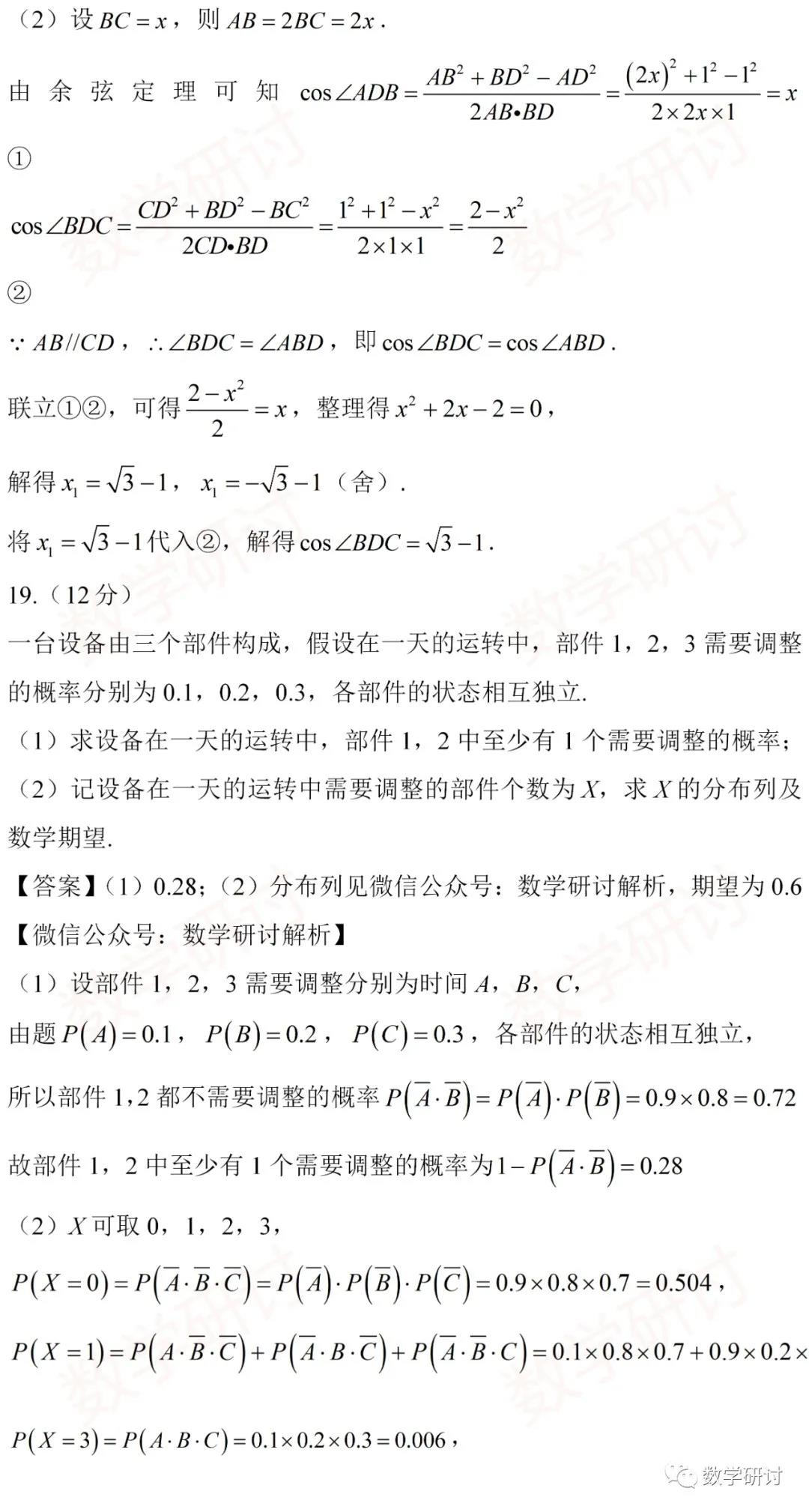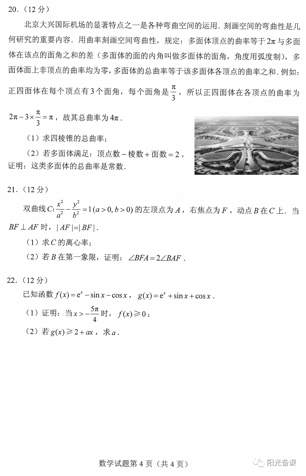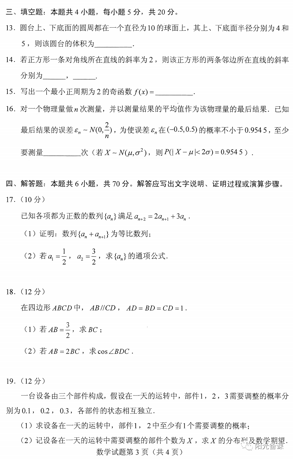 2、主干知识重点考察,数列、三角函数、概率统计、立体几何、解析几何、函数与导数依旧是支撑起试卷的主干,但立体几何与解析几何变化较大,尤其是前者。立体几何放在第4个解答题,中档偏上,但没有出现重点内容中的空间角和距离,而是以应用题的方式考查具有高等几何的背景——曲率,这是包括学生和老师都措手不及的。另外台体的体积公式是不要求记忆的,貌似试卷也没有给出计算公式,无怪乎很多人惊呼考试偏离了轨道。另外,解析几何的大题考查双曲线也是出乎意料的,高考已经将近十年没有出现了,老师们往往都振振有词地强调双曲线不考大题,教辅资料也成功回避了双曲线的大题,这次没想到杀了个回马枪,令人黯然神伤。