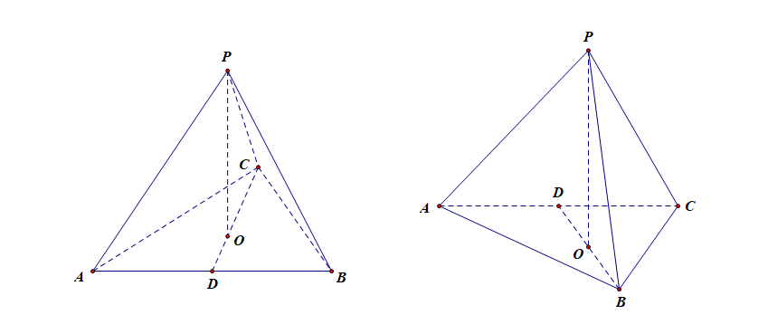 故\(V_{P-ABC}=\cfrac{1}{3}\cdot S_{\triangle ABC}\cdot PO=\cfrac{1}{3}\cdot \cfrac{\sqrt{3}}{4}\cdot(\sqrt{3})^2\cdot \sqrt{3}=\cfrac{3}{4}\),故⑥正确,