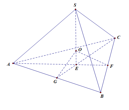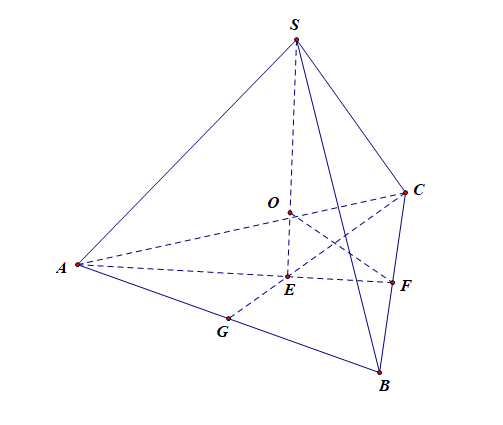 连结 \(SF\) 和 \(SG\),过点 \(O\) 分别作 \(OM\perp SF\) 于 \(M\), \(ON\perp SG\) 于 \(N\),容易说明 \(OE\),\(OM\),\(ON\) 分别是点 \(O\) 到平面 \(ABC\),平面 \(SBC\),平面 \(SAB\)的距离,通过计算能得到 \(OE=OM=ON=\cfrac{\sqrt{6}}{12}a\),同理也能计算点 \(O\) 到平面 \(SAC\) 的距离也是 \(\cfrac{\sqrt{6}}{12}a\),故点 \(O\) 到正四面体的四个表面的距离相等,则点 \(O\) 为内切球的球心,则线段 \(OE\) 为内切球的半径;