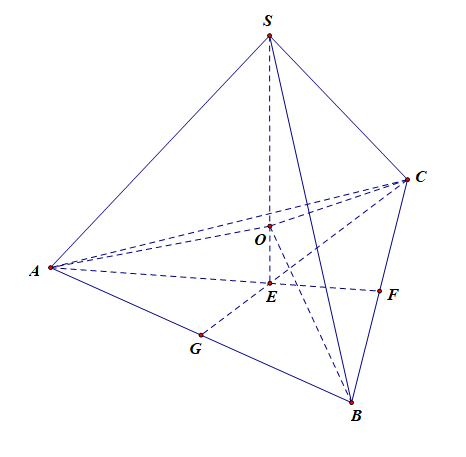 - 如图所示,设正四面体 \(S-ABC\) 的棱长为 \(AB=a\),点 \(E\) 为下底面 \(ABC\) 的中心,则容易证明 \(SE\perp\) 平面 \(ABC\),则 \(SE\) 为 正四面体的高,点 \(O\) 为 \(SE\) 的四等分点且靠近点 \(E\),则线段 \(OE\) 为内切球的半径, 线段 \(OF\) 为棱切球的半径, 线段 \(OS\) 为外接球的半径。