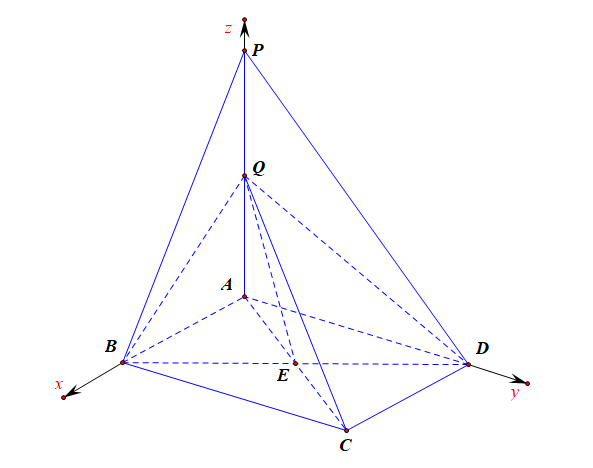 ✍️思路一,空间向量法,由题可知,\(AB\)、\(AP\)、\(AD\) 两两垂直,以 \(A\) 为坐标原点,分别以 \(AB\)、\(AD\)、\(AP\) 所在直线为 \(x\),\(y\),\(z\) 轴建立空间直角坐标系,如图所示。