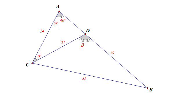 在 \(\triangle CBD\)中,由余弦定理, 得\(\cos\beta=\cfrac{BD^2+CD^2-CB^2}{2BD\cdot CD}\)