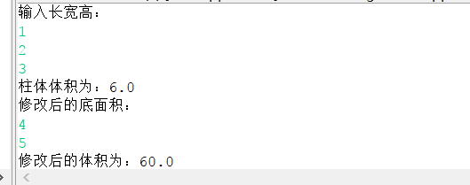 package cn; import java.util.Scanner; public class Test { public static void main(String[] args) { System.out.println("输入长宽高:"); Scanner reader = new Scanner(System.in); Zhuti zh = new Zhuti(); // 创建新的柱体对象 Juxing xin = new Juxing(); // 创建新的矩形对象 xin.m = reader.nextDouble(); xin.n = reader.nextDouble(); Zhuti.h = reader.nextDouble(); System.out.println("柱体体积为:" + (xin.m * xin.n * Zhuti.h)); System.out.println("修改后的底面积:"); xin.m = reader.nextDouble(); xin.n = reader.nextDouble(); System.out.println("修改后的体积为:" + zh.area(xin.m, xin.n) * Zhuti.h); } }