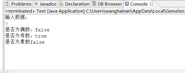package cn; import java.util.Scanner; public class Text { public static void main(String[] args) { MyInteger my = new MyInteger(); System.out.println("输入数据:"); Scanner reader = new Scanner(System.in); my.value = reader.nextInt(); System.out.println("是否为偶数:" + my.isEven()); // 输出:my调用MyInteger类中的isEven()方法 System.out.println("是否为奇数:" + my.isOdd()); // my调用MyInteger类中的isOdd()方法 System.out.println("是否为素数" + my.isPrime(my));// //my调用MyInteger类中的isPrime()方法 } }
