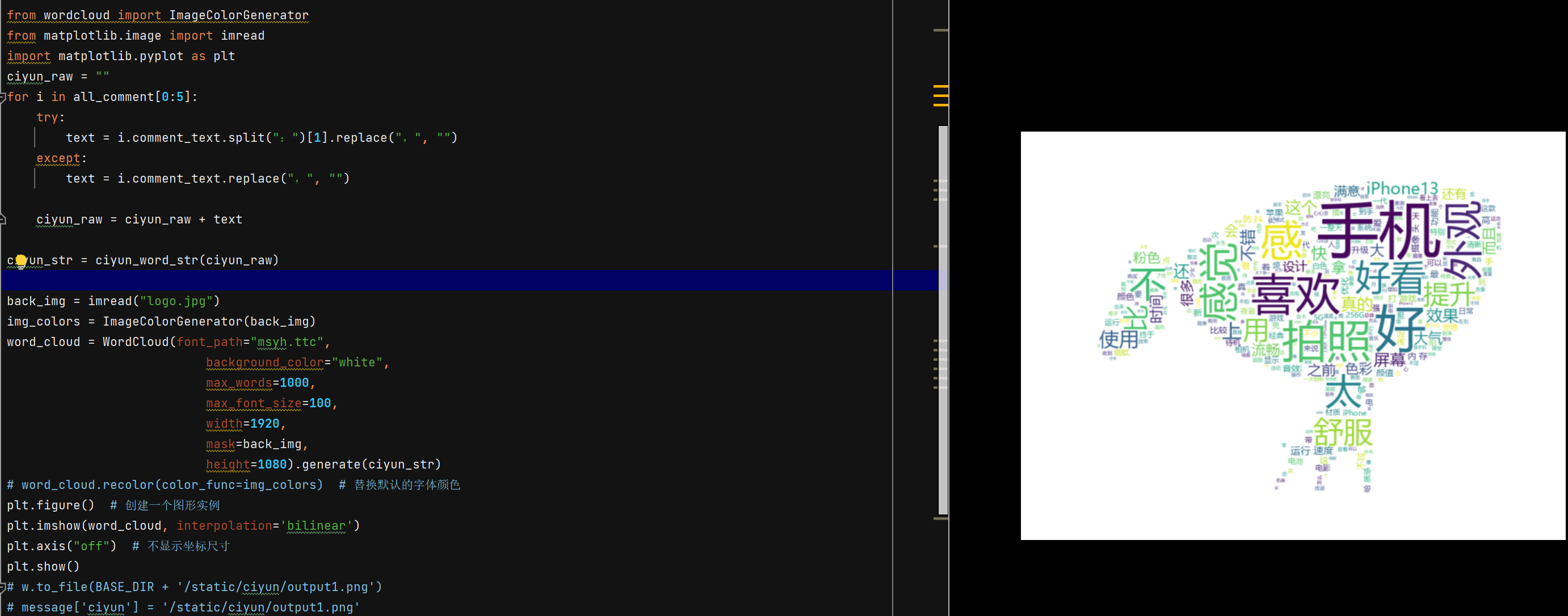 from wordcloud import ImageColorGenerator from matplotlib.image import imread import matplotlib.pyplot as plt # 输出分词组合 ciyun_str = ciyun_word_str(ciyun_raw) back_img = imread("logo.jpg") img_colors = ImageColorGenerator(back_img) word_cloud = WordCloud(font_path="msyh.ttc", background_color="white", max_words=1000, max_font_size=100, width=1920, mask=back_img, height=1080).generate(ciyun_str) # word_cloud.recolor(color_func=img_colors) # 替换默认的字体颜色 plt.figure() # 创建一个图形实例 plt.imshow(word_cloud, interpolation='bilinear') plt.axis("off") # 不显示坐标尺寸 plt.show()