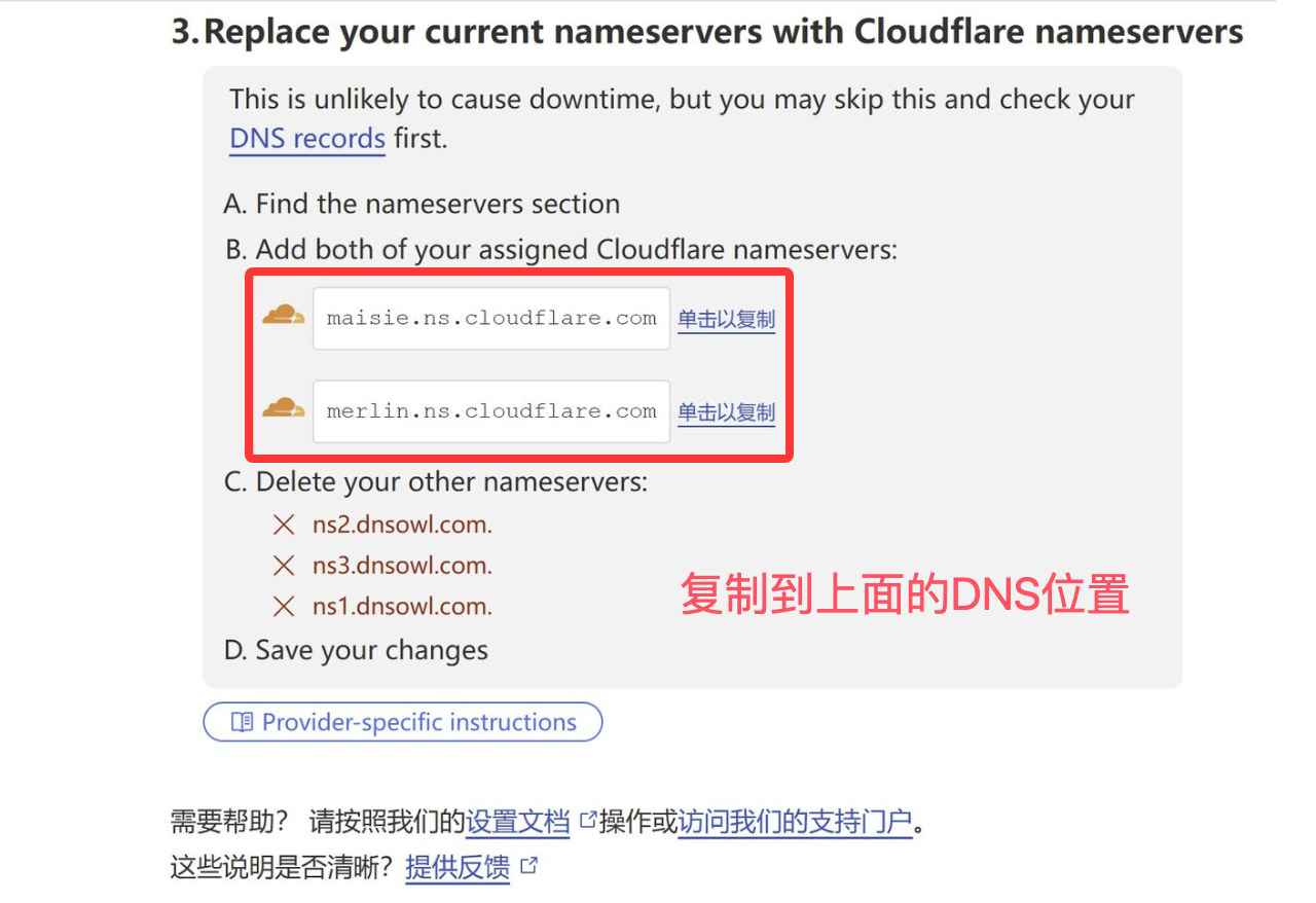3、获取CF的DNS地址(CF主页 - 添加域 - 输入现有域【你的域名】- 继续 - Free计划 - 删除所有DNS记录 - 继续前往激活 - 获取两个DNS填入自定义DNS - 等待激活)