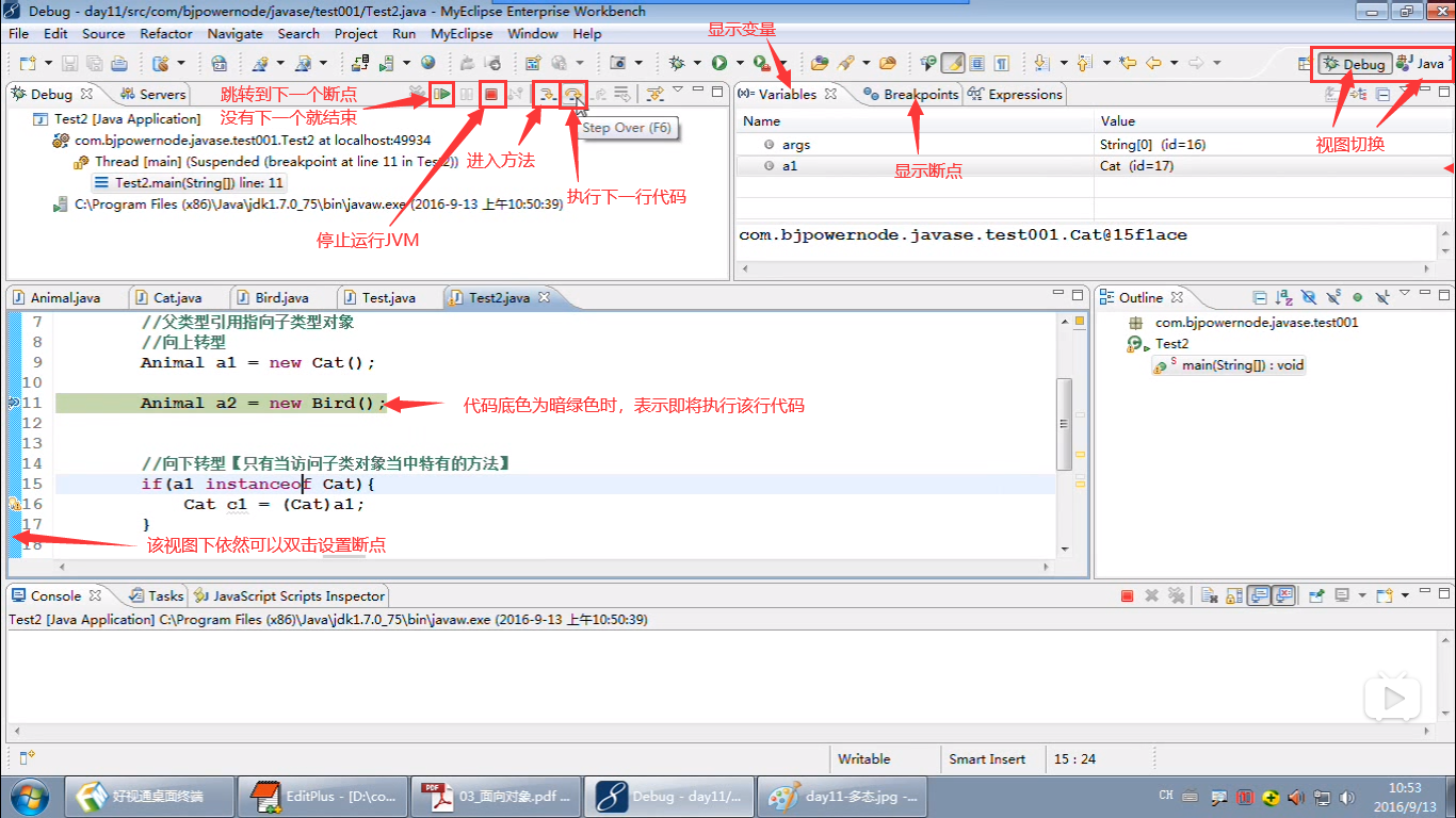 【学会这几个快捷键F5:进入方法,按步执行 F6:执行下一行 F7:方法返回 F8:执行到下一个断点】