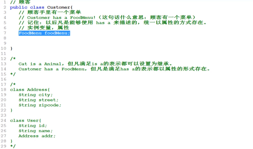【能够以has a 来描述的,统一描述成属性,能够以is a 描述的,统一继承于父类】