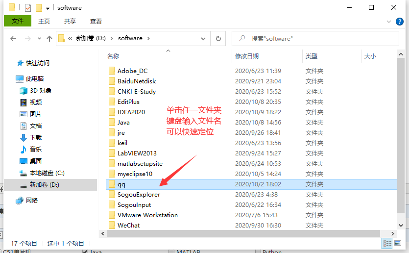 【题外话:单击任一文件夹,键盘输入文件名,可以快速定位】