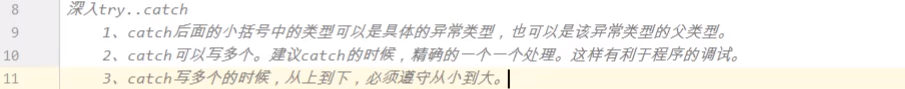 【多个catch时,要求从上到下,从小到大,不能把包含其他异常类的父类放到前面,即同一个类不能多次catch】