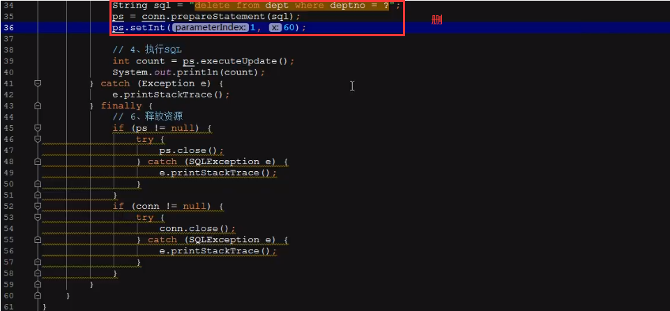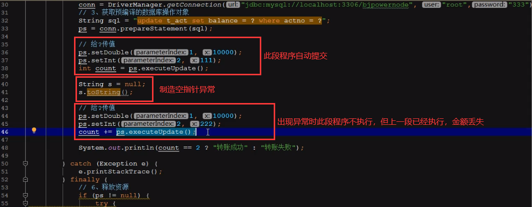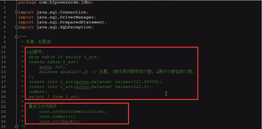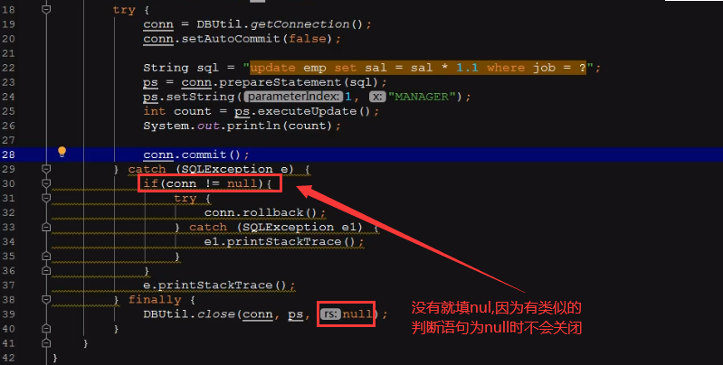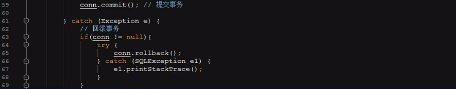 【conn.rollback(); //回滚事务,写在catch语句中,在捕捉异常后进行回滚,直到异常解决后,SQL语句才会执行,数据才会改变】