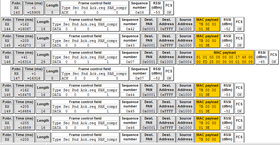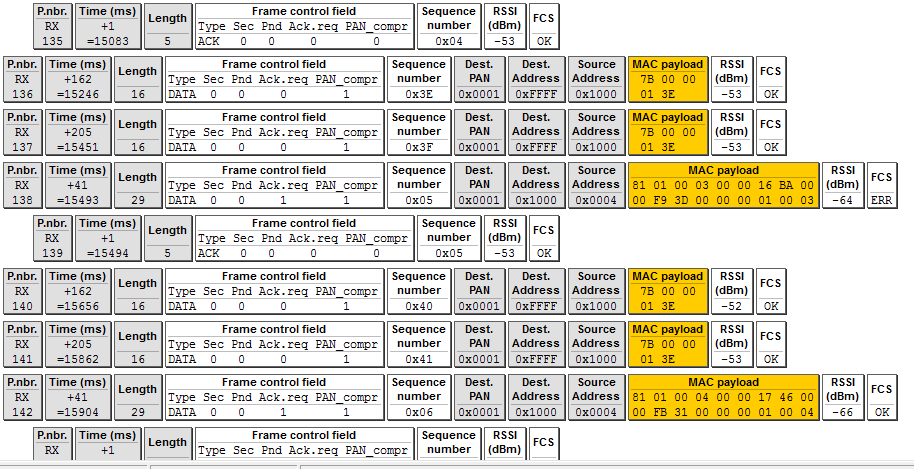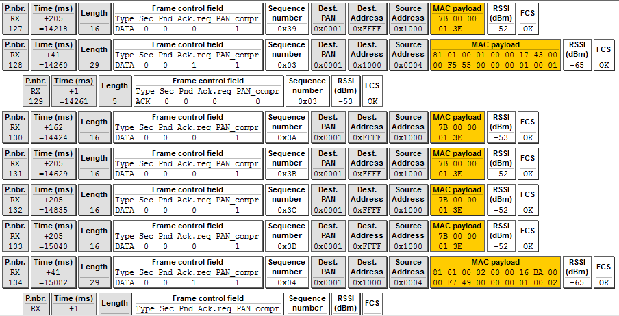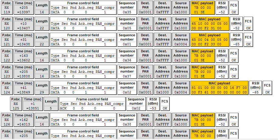 最后发现是普通节点的hex文件下错了,下载正确后,包有规律