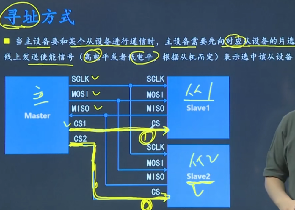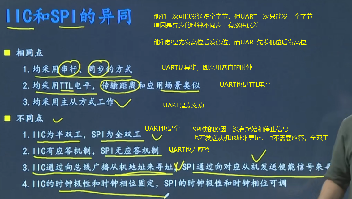 | SPI | 串行 | 全双工 | 同步 | 不限位数 | 先高位后低位 | 无应答 | 一主多从 | 无起始停止位 | 最快 |