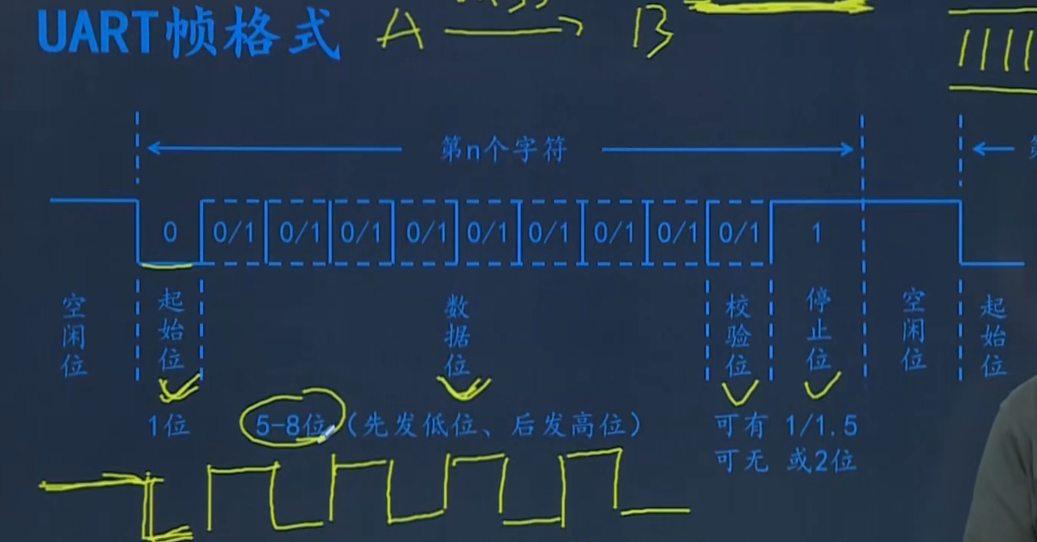 限制位数,5-8位数据位,一次最多发一个字节,这与IIC和SPI不同,后两者均为同步