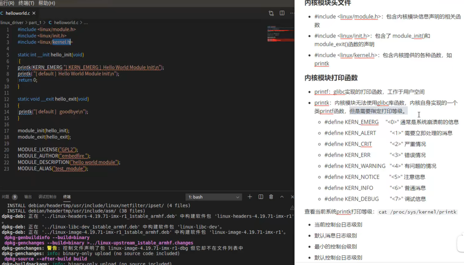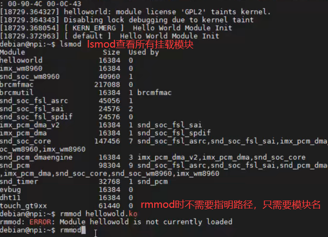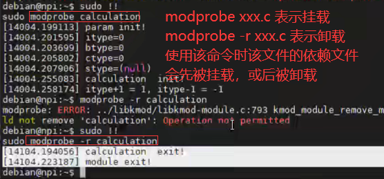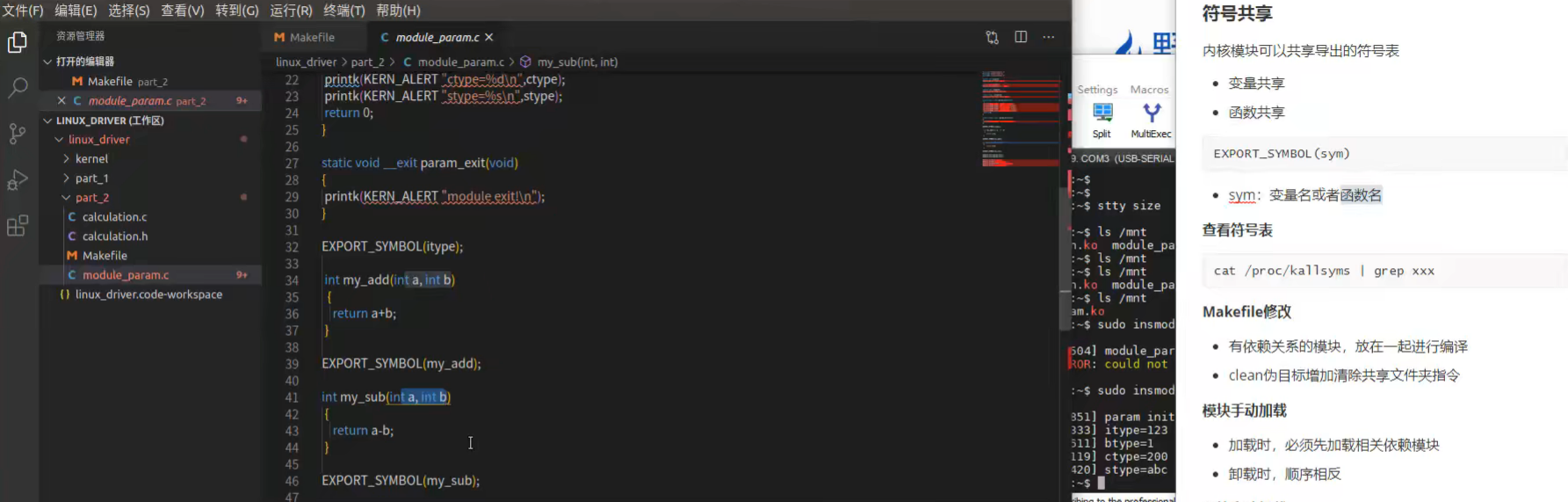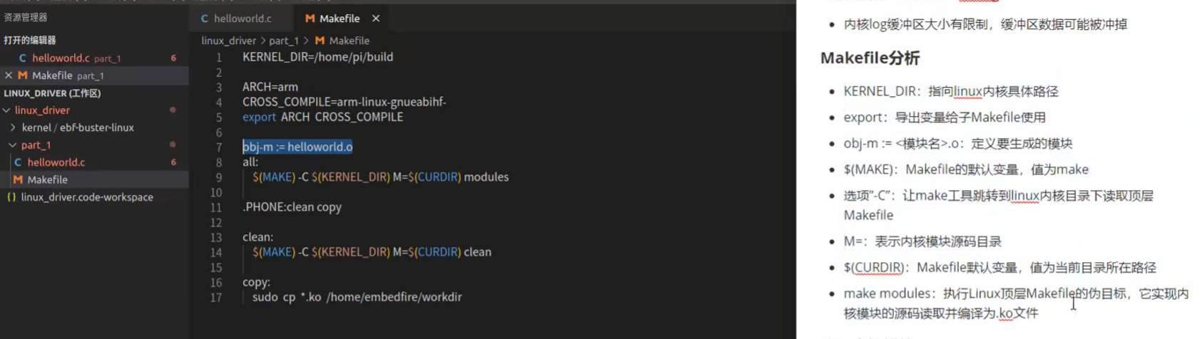 makefile 写好后使用 make 生成的 .ko 文件,然后 make copy 将生成的文件拷贝到共享文件夹,这样就可以在开发板的操作系统中找到,该文件,并进行内核模块module 的挂载 insmod 和卸载 rmmod