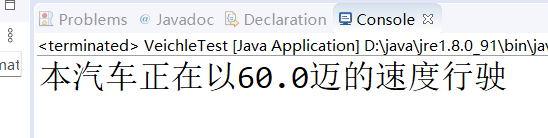 package JavaDemo; public class Vehicle { private final String brand; private String color; private double speed; public Vehicle(String brand, String color) { super(); this.brand = brand; this.color = color; } public void run() { System.out.println("本汽车正在以"+this.speed+"迈的速度行驶"); } ) public String getColor() { return color; } public void setColor(String color) { this.color = color; } public double getSpeed() { return speed; } public void setSpeed(double speed) { this.speed = speed; } public String getBrand() { return brand; } } package JavaDemo; public class VeichleTest { public static void main(String[] args) { // TODO Auto-generated method stub Vehicle v1=new Vehicle("benz","black"); v1.setSpeed(60); v1.run(); } } package JavaDemo; public class VeichleTest { public static void main(String[] args) { // TODO Auto-generated method stub Vehicle v1=new Vehicle("benz","black"); v1.setSpeed(60); v1.run(); } }