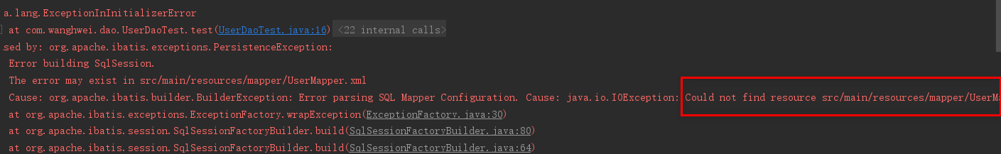 之后测试又报错,说是没有找到src/main/resources/mapper/UserMapper.xml。
