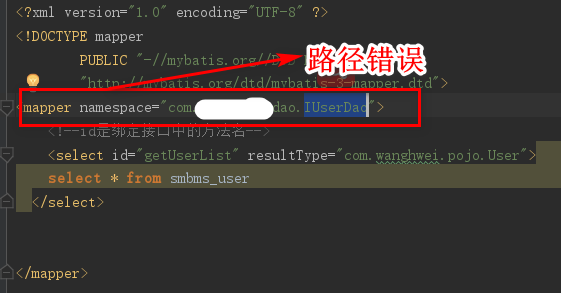 org.apache.ibatis.binding.BindingException: Type interface com.wanghwei.dao.IUserMapper is not known to the MapperRegistry.这个错误的原因是<mapper>中 namespace的命名空间有误