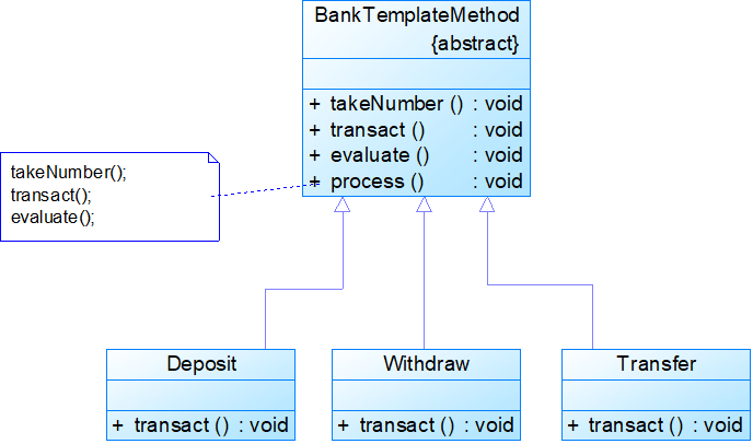 //===================== //抽象父类实现了两个固定方法排队取号,反馈评分,还有一个未实现方法transact //因为业务不同,手续不同,不可一概而论,然后把三个方法当做同意流程打包进process()方法 public abstract class BankTemplateMethod { public void takeNumber() { System.out.println("取号排队。"); } public abstract void transact(); public void evaluate() { System.out.println("反馈评分。"); } public void process() { this.takeNumber(); this.transact(); this.evaluate(); } } //===================== //转账业务,只要实现转账业务即可 public class Transfer extends BankTemplateMethod { public void transact() { System.out.println("转账"); } } //==================== //存款取款也是一样 public class Deposit extends BankTemplateMethod { public void transact() { System.out.println("存款"); } } //======================== public class Withdraw extends BankTemplateMethod { public void transact() { System.out.println("取款"); } } //========================= public class Client { public static void main(String a[]) { BankTemplateMethod bank; bank=new Transfer() ;//客户要取款 bank.process(); System.out.println("---------------------------------------"); } }