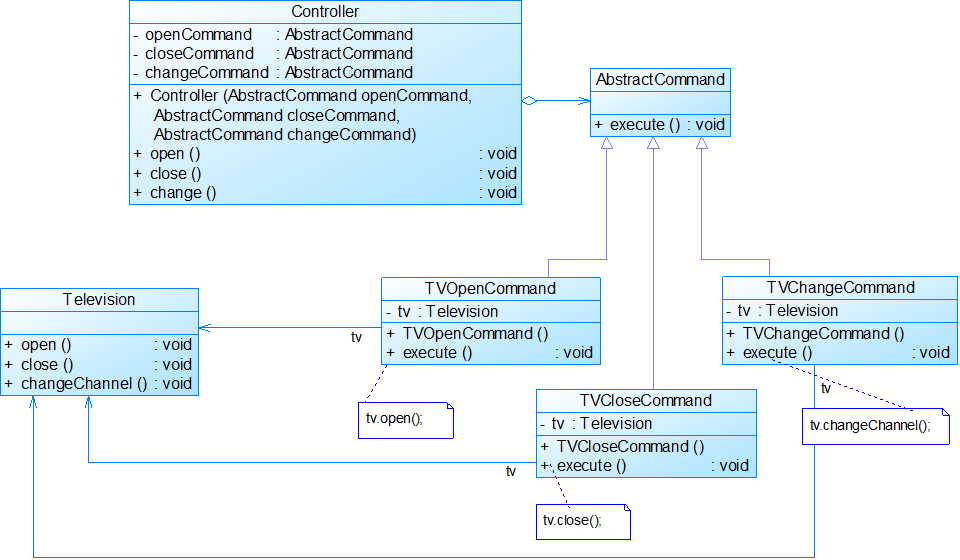 //============== //基础的抽象命令 public interface AbstractCommand { public void execute(); } //=================== //具体命令的实现,开关电视,换台,命令实现的时候就固定好了接收者,使用接收者的方法 public class TVOpenCommand implements AbstractCommand { private Television tv; public TVOpenCommand() { tv = new Television(); } public void execute() { tv.open(); } } //=============== public class TVChangeCommand implements AbstractCommand { private Television tv; public TVChangeCommand() { tv = new Television(); } public void execute() { tv.changeChannel(); } } //============== public class TVCloseCommand implements AbstractCommand { private Television tv; public TVCloseCommand() { tv = new Television(); } public void execute() { tv.close(); } } //=================== //接收者,在这里就是电视机类,实现方法供命令类使用 public class Television { public void open() { System.out.println("打开电视机!"); } public void close() { System.out.println("关闭电视机!"); } public void changeChannel() { System.out.println("切换电视频道!"); } } //=============== //开关控制器,只负责调用命令,不知道命令的具体是怎么实现的,如果命令改了,想去控制空调了,它也不一定用改 public class Controller { private AbstractCommand openCommand,closeCommand,changeCommand; public Controller(AbstractCommand openCommand,AbstractCommand closeCommand,AbstractCommand changeCommand) { this.openCommand=openCommand; this.closeCommand=closeCommand; this.changeCommand=changeCommand; } public void open() { openCommand.execute(); } public void change() { changeCommand.execute(); } public void close() { closeCommand.execute(); } } //==================== //客户端的调用 public class Client { public static void main(String a[]) { AbstractCommand openCommand,closeCommand,changeCommand; openCommand = new TVOpenCommand(); closeCommand = new TVCloseCommand(); changeCommand = new TVChangeCommand(); Controller control = new Controller(openCommand,closeCommand,changeCommand); control.open(); control.change(); control.close(); } }