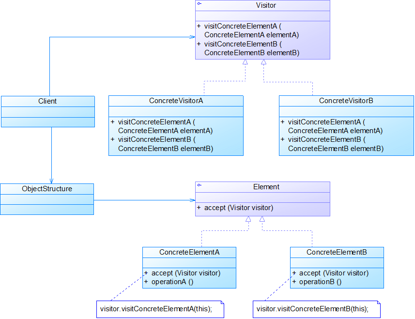 public class ConcreteElementA implements Element { public void accept(Visitor visitor) { visitor.visit(this); } public void operationA() { //业务方法 } }