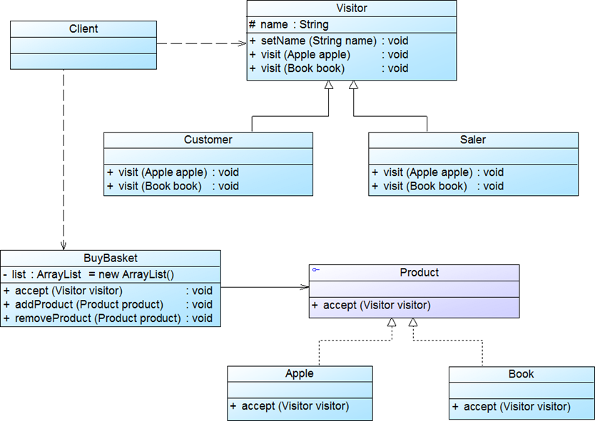 } } //================ public class Book implements Product { public void accept(Visitor visitor) { visitor.visit(this); } } //===================== //购物车,里面有List存放这些产品,能对产品进行增删操作 //这里类似于组合模式,在购物车这个层面上被访问,实际访问的是产品 public class BuyBasket { private ArrayList list=new ArrayList(); public void accept(Visitor visitor) { Iterator i=list.iterator(); while(i.hasNext()) { ((Product)i.next()).accept(visitor); } } public void addProduct(Product product) { list.add(product); } public void removeProduct(Product product) { list.remove(product); } } //====================== //Vistor抽象类,使用多态,访问不同产品,实现也要不同 //相对的不同vistor访问产品,发生的事件也不同,顾客访问就是要买,收银员访问是为了卖 public abstract class Visitor { protected String name; public void setName(String name) { this.name=name; } public abstract void visit(Apple apple); public abstract void visit(Book book); } //================== //顾客实现 public class Customer extends Visitor { public void visit(Apple apple) { System.out.println("顾客" + name + "选苹果。"); } public void visit(Book book) { System.out.println("顾客" + name + "买书。"); } } //======================== //收银员实现 public class Saler extends Visitor { public void visit(Apple apple) { System.out.println("收银员" + name + "给苹果过秤,然后计算其价格。"); } public void visit(Book book) { System.out.println("收银员" + name + "直接计算书的价格。"); } } //============== //用户端代码 public class Client { public static void main(String a[]) { Product b1=new Book(); Product b2=new Book(); Product a1=new Apple(); Visitor visitor; BuyBasket basket=new BuyBasket(); basket.addProduct(b1); basket.addProduct(b2); basket.addProduct(a1); visitor=new Customer(); visitor.setName("张三"); basket.accept(visitor); } }