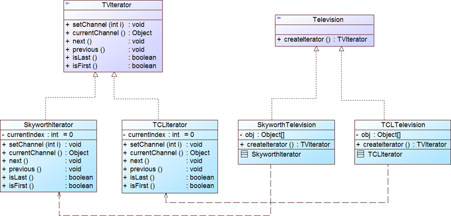 class ConcreteAggregate implements Aggregate { ...... public Iterator createIterator() { return new ConcreteIterator(this); } ...... }