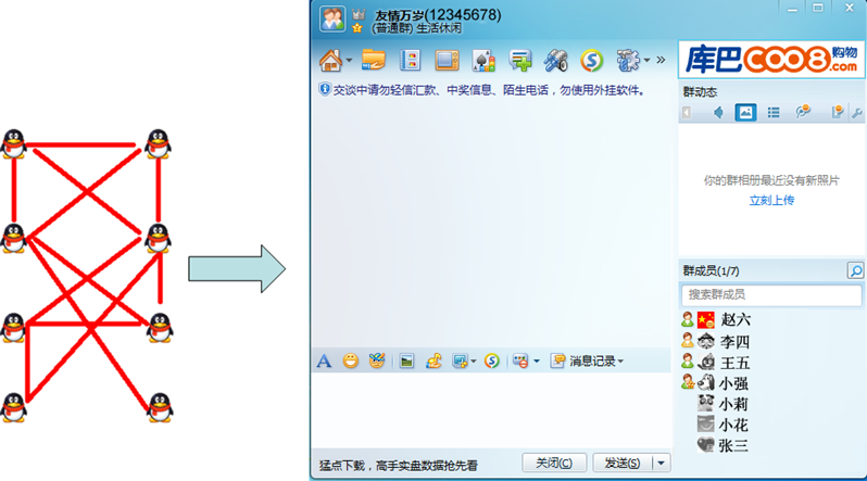 如果使用QQ群,一个用户就可以向多个用户发送相同的信息和文件而无须一一进行发送。