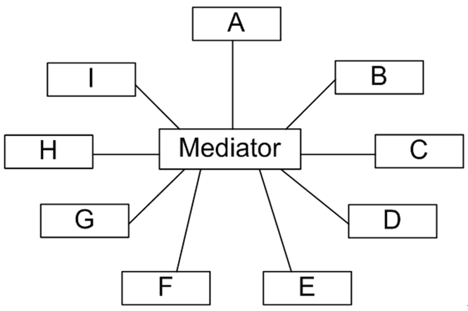 如图所示。在这个星形结构中,同事对象不再直接与另一个对象联系,它通过中介者对象与另一个对象发生相互作用。中介者模式是“迪米特法则”的一个典型应用。