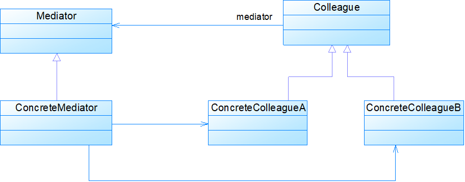 class ConcreteMediator extends Mediator { //实现业务方法,封装同事之间的调用 public void operation() { ...... ((Colleague)(colleagues.get(0))).method1(); //通过中介者调用同事类的方法 ...... } }