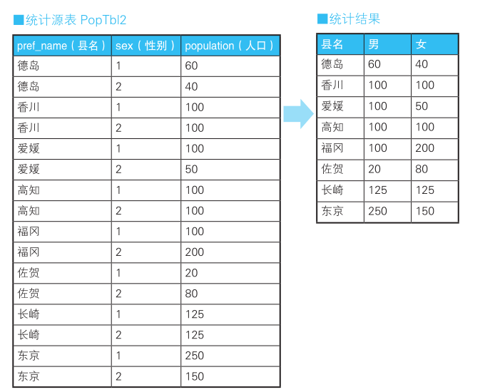 SELECT pref_name, -- 男性人口 SUM( CASE WHEN sex = ' 1 ' THEN population ELSE 0 END) AS cnt_m, -- 女性人口 SUM( CASE WHEN sex = ' 2 ' THEN population ELSE 0 END) AS cnt_f FROM PopTbl2 GROUP BY pref_name;