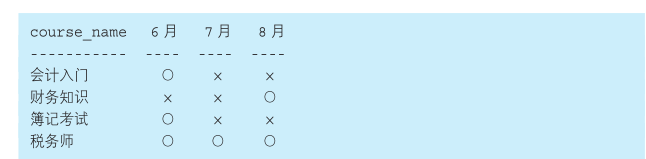 SELECT course_name, CASE WHEN course_id IN (SELECT course_id FROM OpenCourses WHERE month = 200706) THEN ' ○ ' ELSE ' × ' END AS "6 月", CASE WHEN course_id IN (SELECT course_id FROM OpenCourses WHERE month = 200707) THEN ' ○ ' ELSE ' × ' END AS "7 月", CASE WHEN course_id IN (SELECT course_id FROM OpenCourses WHERE month = 200708) THEN ' ○ ' ELSE ' × ' END AS "8 月" FROM CourseMaster;