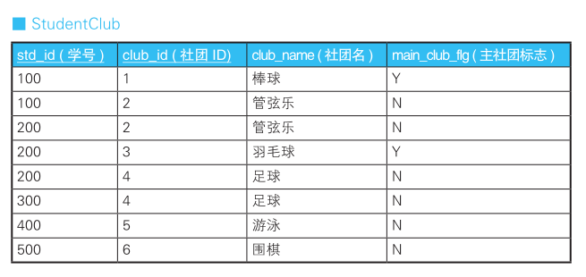 StudentClub 所示,这张表的主键是“学号、社团 ID”,存储了学生和社团之间多对多的关系