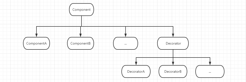 最顶层的Component是接口,对应到IO的就是InputStream这个抽象类。ComponentA,ComponentB是实际的子类,对应到IO的就是FileInputStream、ServletInputStream这些数据源。Decorator是用于实现各个符驾功能的抽象装饰器,对应到IO的就是FilterInputStream。而Docorator派生的就是一个一个的装饰器,它们每个都有独立的功能,对应到IO的就是BufferedInputStream,GZIPInputStream等。