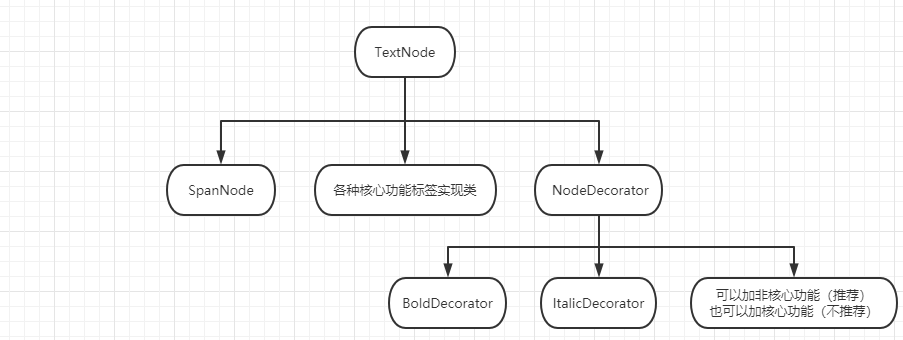 可以看到,对于文本进行设置以后,文本就可以达到具有标签的效果了,然而对于一些非核心的标签,但是经常需要用到,实现便于灵活使用的效果,我们要先定义一个装饰者抽象类NodeDecorator: