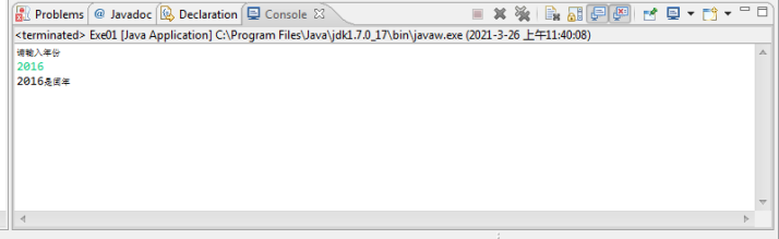 import java.util.Scanner; public class Exe01 { /** * @param args */ public static void main(String[] args) { System.out.println("请输入年份"); Scanner input = new Scanner(System.in); int a = input.nextInt(); if (a % 4 == 0 || a % 100 != 0 && a % 400 == 0) { System.out.println(a + "是闰年"); } else { System.out.println(a + "不是闰年"); } } }