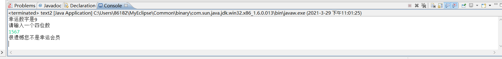 import java.util.Random; import java.util.Scanner; public class text2 { /** * @param args */ public static void main(String[] args) { // TODO Auto-generated method stub Random r=new Random(); Scanner input=new Scanner(System.in); int a=r.nextInt(10); System.out.println("幸运数字是"+a); System.out.println("请输入一个四位数"); int b=input.nextInt(); if(b%100/100==a){ System.out.println("恭喜您是幸运会员"); } else{ System.out.println("很遗憾您不是幸运会员"); } } }