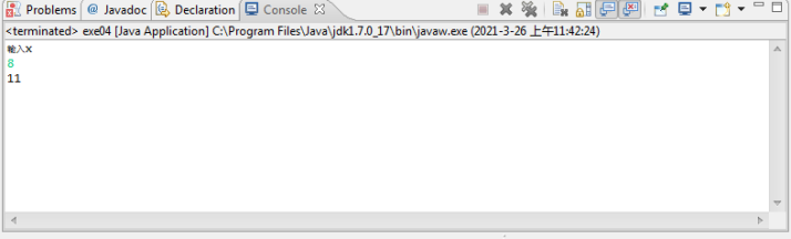 import java.util.Scanner; public class exe04 { /** * @param args */ public static void main(String[] args) { // TODO Auto-generated method stub System.out.println("输入x"); Scanner input = new Scanner(System.in); int x = input.nextInt(); int y; if (x > 0) { y = x + 3; System.out.println(y); } else if (x == 0) { y = 0; System.out.println(y); } else if (x < 0) { y = x * 2 - 1; System.out.println(y); } } }