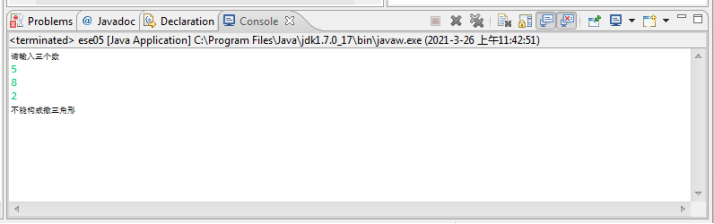 import java.util.Scanner; public class ese05 { /** * @param args */ public static void main(String[] args) { // TODO Auto-generated method stub System.out.println("请输入三个数"); Scanner input = new Scanner(System.in); int a = input.nextInt(); int b = input.nextInt(); int c = input.nextInt(); if (a + b > c && a + c > b && b + c > a) { System.out.println("能构成三角形"); } else { System.out.println("不能构成撒三角形"); } } }