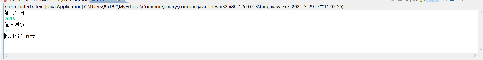 import java.util.Scanner; public class text { /** * @param args */ public static void main(String[] args) { // TODO Auto-generated method stub Scanner input=new Scanner(System.in); System.out.println("输入年份"); int b=input.nextInt(); System.out.println("输入月份"); int a=input.nextInt(); if (a==2) { if (b%4==0&&b%100!=0||b%400==0) { System.out.println("该月份有29天"); } else{ System.out.println("该月份有28天"); } } if (a==1||a==3||a==5||a==7||a==8||a==10||a==12) { System.out.println("该月份有31天"); } if (a==11||a==4||a==6||a==9){ System.out.println("该月份有30天"); } } }