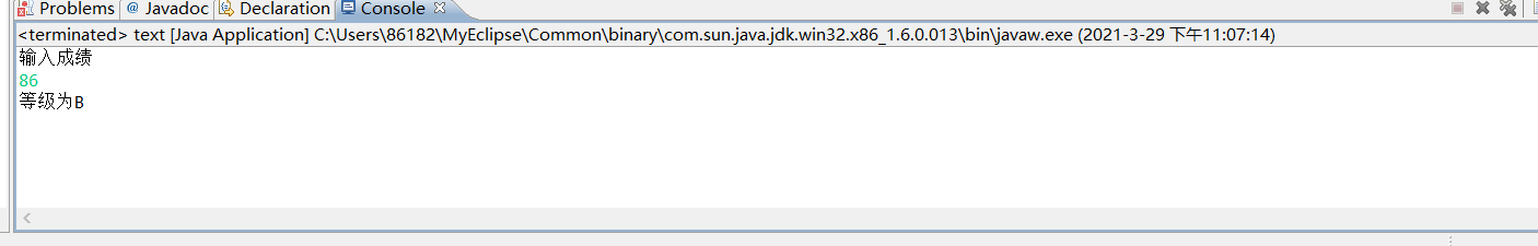 import java.util.Scanner; public class text { /** * @param args */ public static void main(String[] args) { // TODO Auto-generated method stub Scanner input=new Scanner(System.in); System.out.println("输入成绩"); int a=input.nextInt(); int b=a/10; switch (b) { case 10: System.out.println("等级为A"); break; case 9: System.out.println("等级为A"); break; case 8: System.out.println("等级为B"); break; case 7: System.out.println("等级为C"); break; case 6: System.out.println("等级为D"); break; case 5: System.out.println("等级为E"); break; case 4: System.out.println("等级为E"); break; case 3: System.out.println("等级为E"); break; case 2: System.out.println("等级为E"); break; case 1: System.out.println("等级为E"); break; case 0: System.out.println("等级为E"); break; default: break; } } }