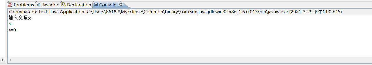 import java.util.Scanner; public class text { /** * @param args */ public static void main(String[] args) { // TODO Auto-generated method stub Scanner input= new Scanner(System.in); System.out.println("输入变量x"); int x=input.nextInt(); if (x==1||x==5||x==10){ switch(x){ case(1): System.out.println("x=1"); break; case(5): System.out.println("x=5"); break; case(10): System.out.println("x=10"); break; } } else{ System.out.println("x=none"); } // TODO Auto-generated method stub } }
